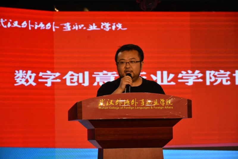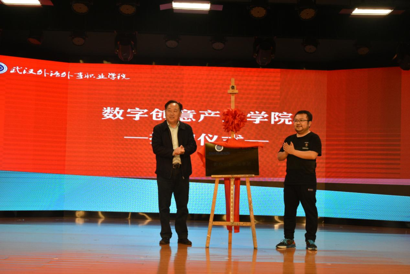 联合沃尔德(湖北)数字科技有限公司付保瑞总经理进行“数字创意产业学院协同育人模式”主题演讲。随后,付保瑞和李相朋共同为我院数字创意产业学院揭牌。