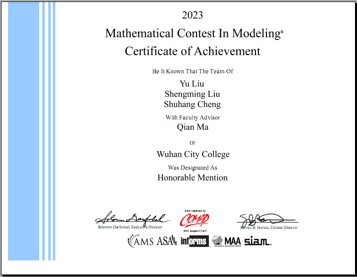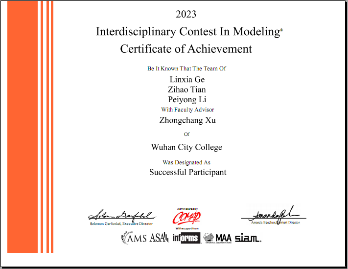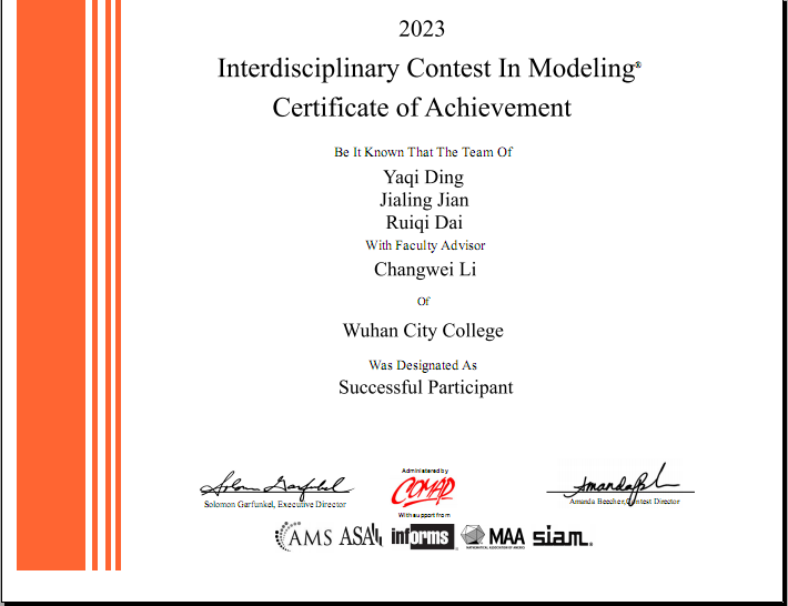 新闻网讯(通讯员 李长伟)近日,2023年美国大学生数学建模竞赛(MCM/ICM)结果揭晓,我院3支参赛队伍全部获奖,其中二等奖(HonorableMention)1项、三等奖(Successful Participant)2项。
