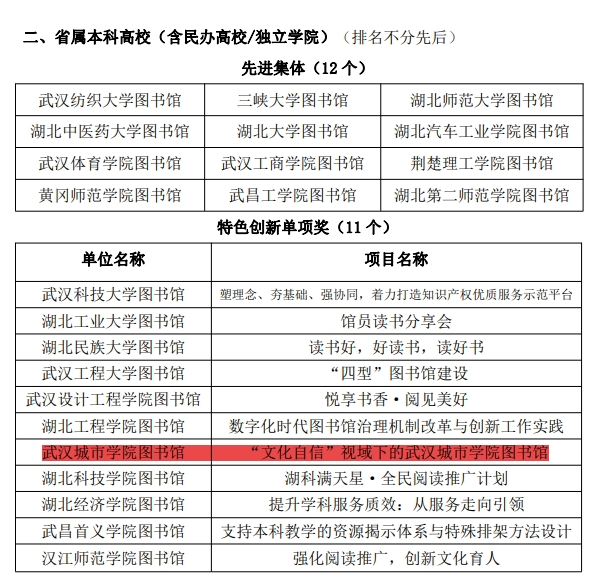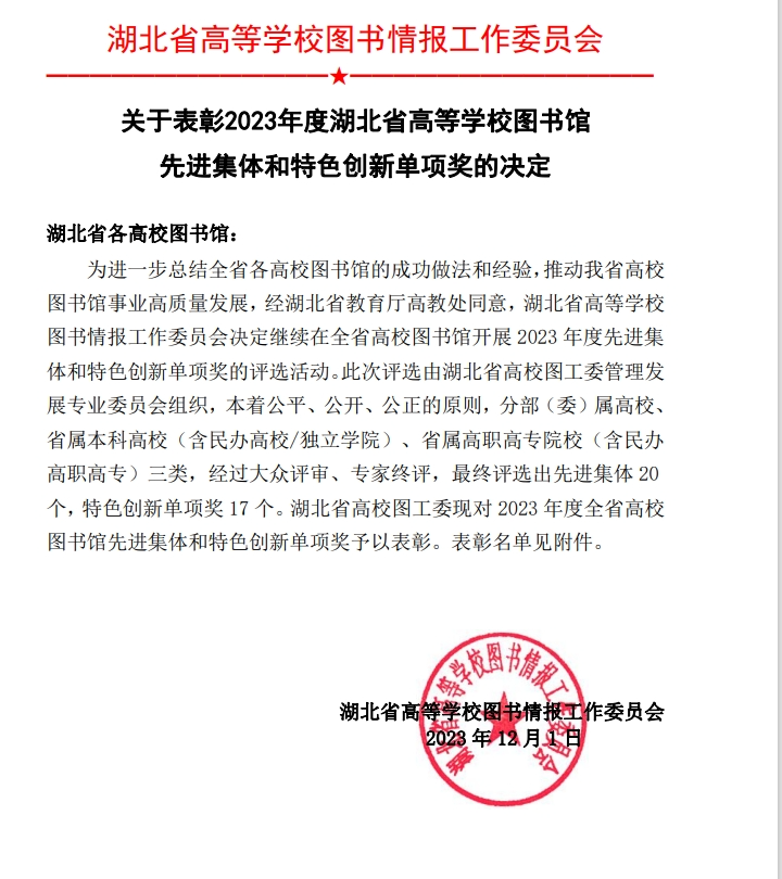 由湖北省高等学校图书情报工作委员会组织,在全省高校图书馆开展的2023 年度先进集体和特色创新单项奖的评选活动,经过大众评审、专家终评,最终评选出先进集体 20 个,特色创新单项奖 17 个。其中,11所省属本科高校图书馆荣获“特色创新单项奖”,我院图书馆榜上有名。本次获奖是我院图书馆继荣获2022年度湖北省高等学校图书馆先进集体称号后所获得的又一殊荣。