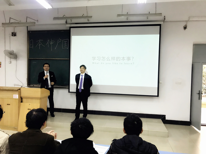 日本神户国际大学副校长桑迫正贺(右)和中国区负责人李勇(左)给同学们作介绍