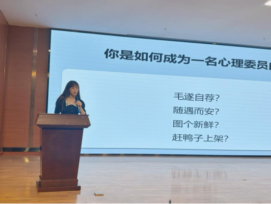 随后,心理健康教育中心喻子曦老师围绕“心理委员的角色定位、必备品质与核心技能”展开专题培训。喻子曦老师结合高校心理健康工作的实际需求,深入浅出地讲解了心理委员的职责范围,包括观察与倾听、心理支持、信息反馈、活动组织等核心任务。她特别强调,一名优秀的心理委员应具备同理心、保密意识、责任感等关键品质,并通过真实案例分析了心理委员在日常工作中可能遇到的挑战及应对策略。