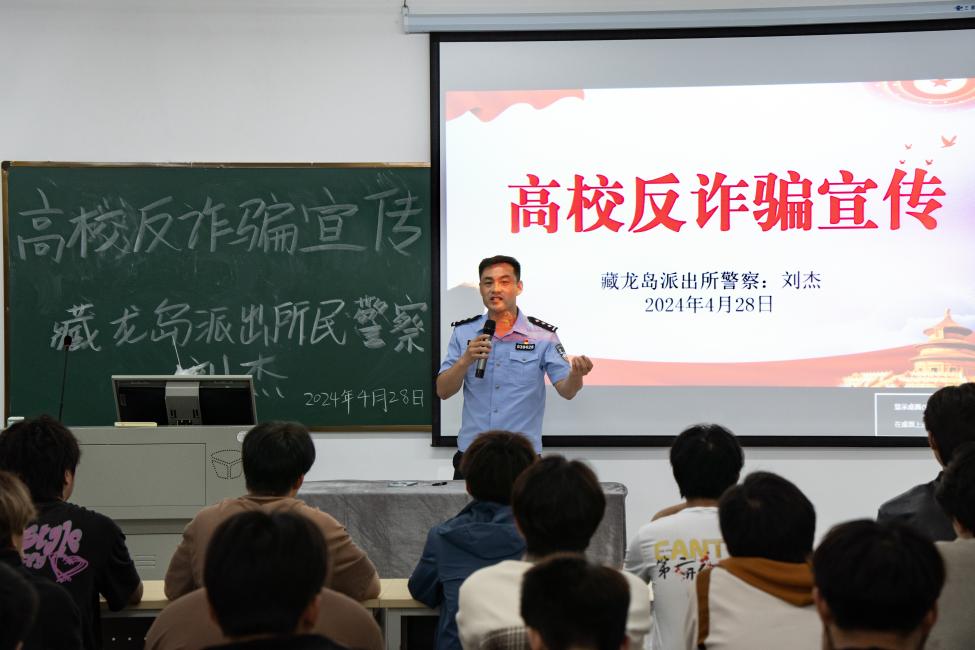 新闻网讯(实习记者刘梦晨 摄影吴子瑞)4月28日晚,学院3号教学楼105教室座无虚席,一场别开生面的防诈骗讲座正在这里举行。本次讲座由藏龙岛派出所警察兼学院驻校民警刘杰主讲,旨在提高广大学生的防诈骗意识,增强自我保护能力。
