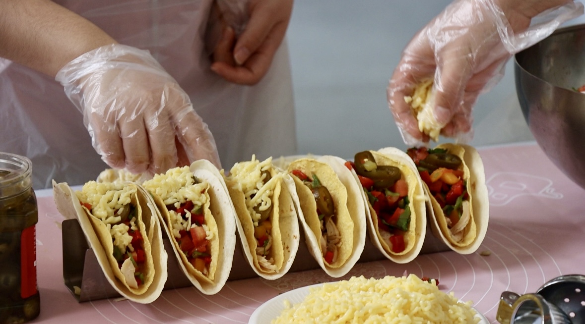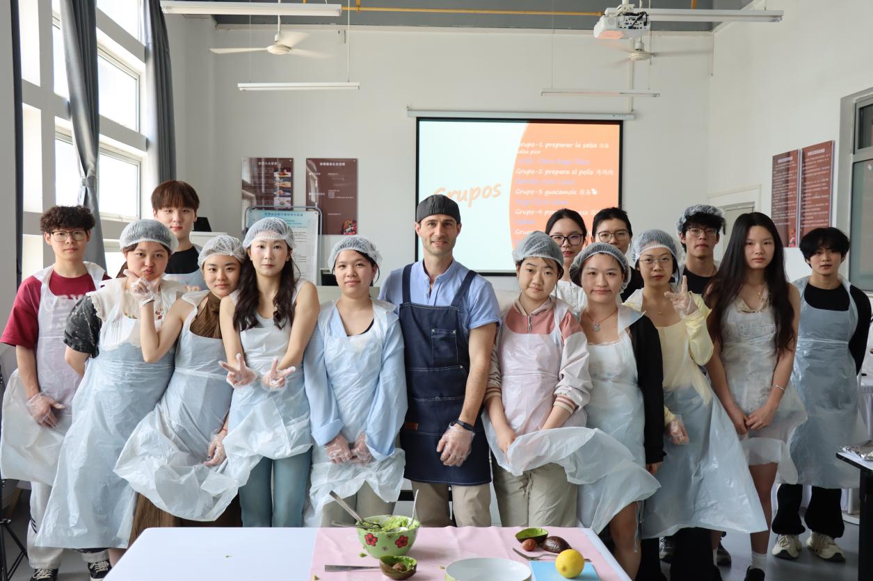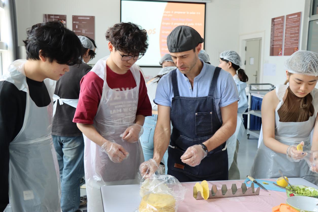 课程开始,Ruben老师借助实物展示与图文板书,用西班牙语系统讲解制作所需的玉米面饼(tortilla)、牛油果酱(guacamole)、辣椒(chile)等食材名称,并重点强调刀具使用规范(normas de seguridad)、微波炉操作(operación del microondas)等安全注意事项。学生们通过记录专业词汇、复述操作步骤,在真实场景中掌握方位介词、祈使句等语法结构。学生们纷纷表示,“当Ruben老师用西语描述‘将馅料横向平铺于饼皮中央'时,我们对空间方位词的理解比课本习题更直观。”