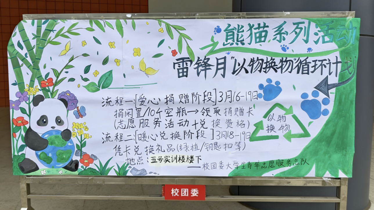 新闻网讯(通讯员 周青 陈泷 宁周滢)为弘扬新时代雷锋精神,倡导绿色环保与公益共享理念,近日,校团委大学生青年志愿服务总队在5号实训楼一楼开展了熊猫系列活动之雷锋月“以物换物”循环计划,吸引了众多师生积极参与,以闲置循环传递温暖,用实际行动书写青春公益答卷。