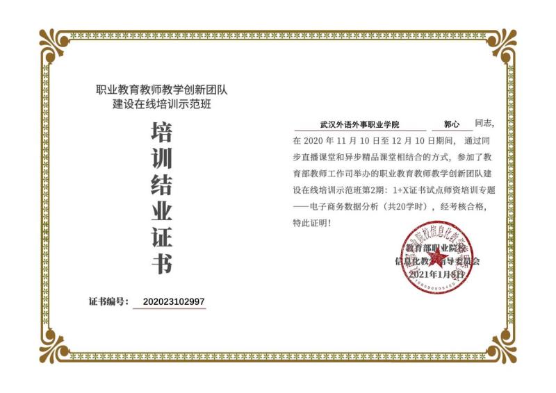 本次培训经费由教育部统一负担,培训结束后,由教育部信息化教学指导委员会统一发放培训结业电子证书,参训人员培训学时计入继续教育学时。本次培训内容丰富,持续时间长,覆盖到了各层级教师,对于财经与商贸学部提高“双师型”教师队伍建设水平,深化教师、教材、教法“三教”改革,推广1+X证书试点工作等提供了强有力的师资保障。