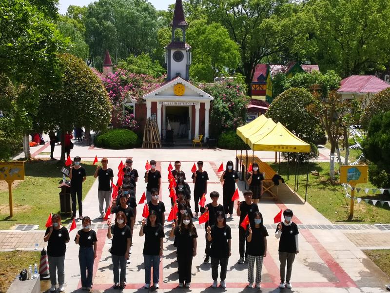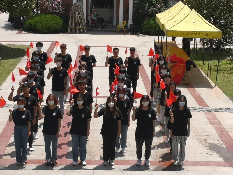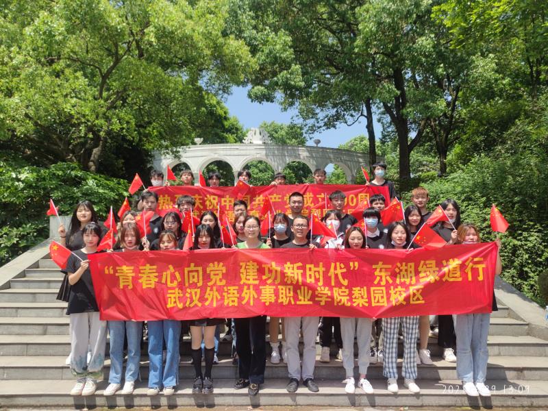 当日中午12:10,参加活动的人员在办公大楼前集合,组队徒步至东湖绿道。路上所有学生干部手持国旗分享了他们对“五四运动”及中国共产党的成立历程,到达目标地点后,所有成员在负责人的带领下,队列组成“五四” “100”队形,庆祝中国共产党建党100周年。