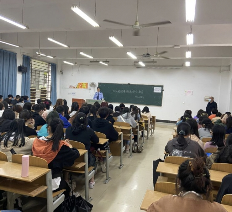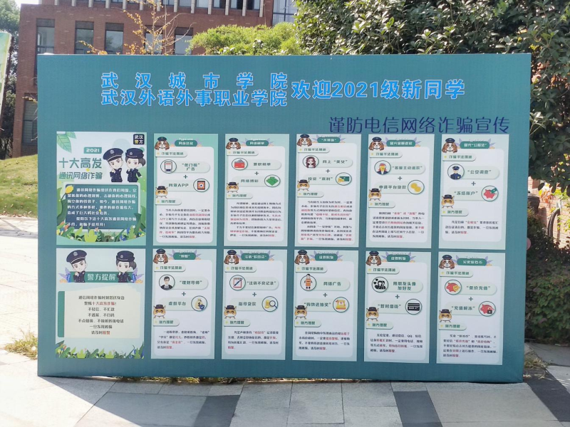 学院各部门、各学部多举措增强新生安全防范意识:保卫处组织人员协同国旗班成员前往新生宿舍进行“一对一”口头宣传和发放宣传资料;保卫处和学工处教职工在学生公寓门口、楼道口、食堂及教学楼等处张贴反诈骗宣传单和悬挂宣传横幅;各学部辅导员定期召开防范电信网络诈骗宣传主题班会,确保每位学生下载国家中心反诈APP,关注学院的“落雁反诈”抖音平台、“终结诈骗服务号”“金钟罩防诈骗”等公众号,提高学生的防骗意识和识骗能力;学院以班级为单位,在全校范围内组织反电诈知识竞赛,提高了防范诈骗的知晓率和普及率。