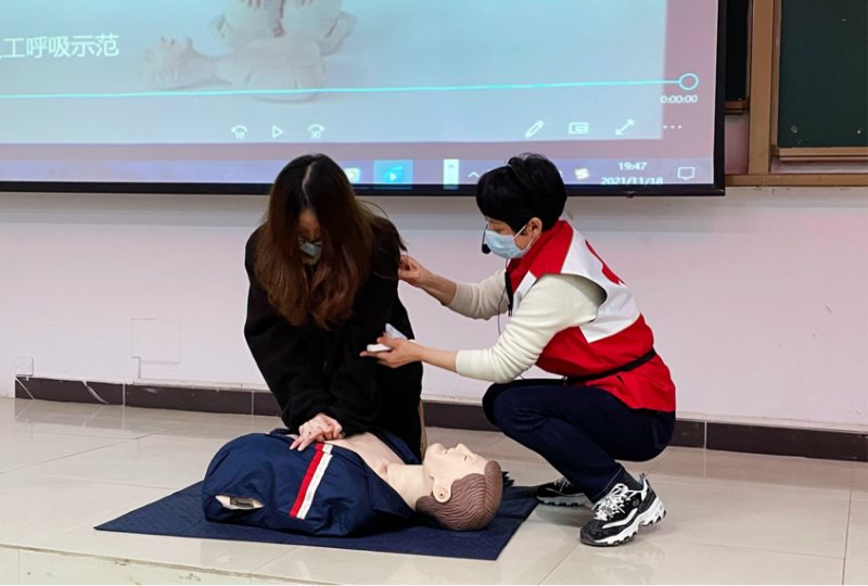 陈爱丽老师强调了当遇到需要急救人员时把握黄金4分钟的重要性以及掌握心肺复苏术的必要性,“心肺复苏是一个生存链,现场施救很重要”,她以自身的专业知识详尽讲解了心肺复苏的三个环节——胸外按压、开放气道、人工呼吸的原理和正确做法,特别举例了在疫情期间判断急救人员呼吸状况的方法,并为能使学生们更加直观地学习,使用了模拟人进行现场演示,强调了急救时须做出准确无误的动作要领。