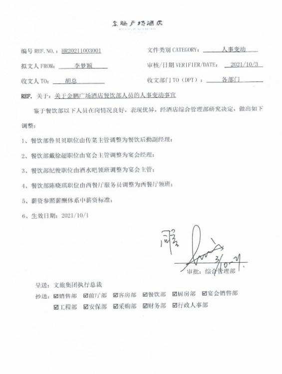 10月1日,在总经理正式签署发布的内部文件上,陈晓琪升职为西餐厅领班。身份的转变,带给陈晓琪的不仅是荣耀和认可,更是前行奋斗的不竭动力。