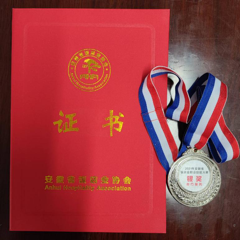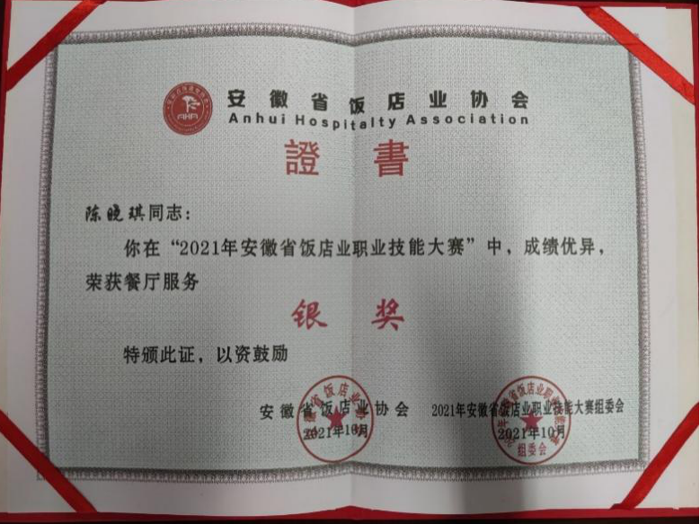 “无奋斗,不青春。”陈晓琪在酒店的支持下,报名参加了2021年安徽省饭店业职业技能大赛,比赛中陈晓琪再次释放其创造潜能,显现出精湛技艺,经过激烈的角逐,荣获餐厅服务赛项银奖的好成绩。
