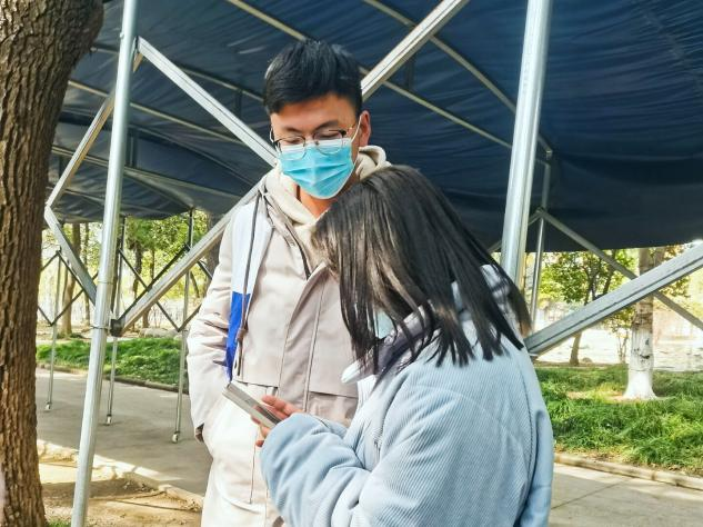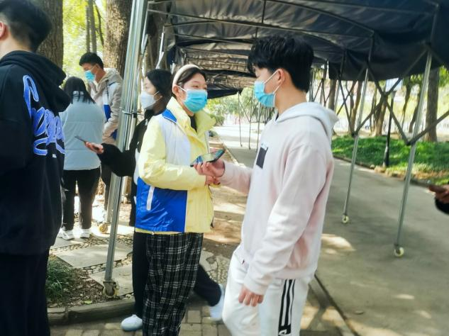 医务室旁,志愿者们维持着秩序,为前来做核酸的同学们提供帮助,查验同学们的健康码以及行程码,用行动诠释了奉献、友爱、互助、进步的志愿服务精神。