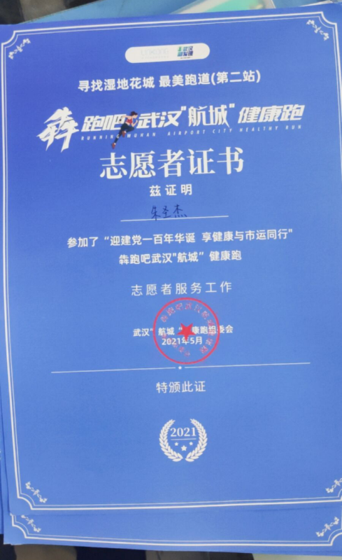 赠人玫瑰,手有余香。朱圣杰曾有过这样一段记忆深刻的志愿经历。奔跑吧武汉“航城”健康跑活动当天,朱圣杰作为志愿者清晨5点便早早出发,顾不上吃早饭,他与朋友一起出发去现场,因路上耽搁,将近8点才到活动现场,只见大家都已在各自岗位上忙碌,他也赶紧投身到工作当中。9点,各位参赛者陆续抵达终点,跑完半马的他们喘着气,朱圣杰拿着物资包与奖牌上前递给参赛选手们。“谢谢你,小伙子!今天把我累坏了,幸亏你给我送水。”跑完步,一位老人对他表示感谢。一声声的感谢让他顿感整个上午的疲惫也就算不了什么。