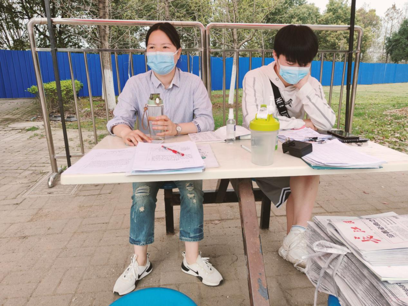 学部学生党支部书记、辅导员冯婷老师和学生干部贺昊天值守
