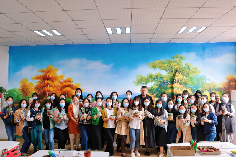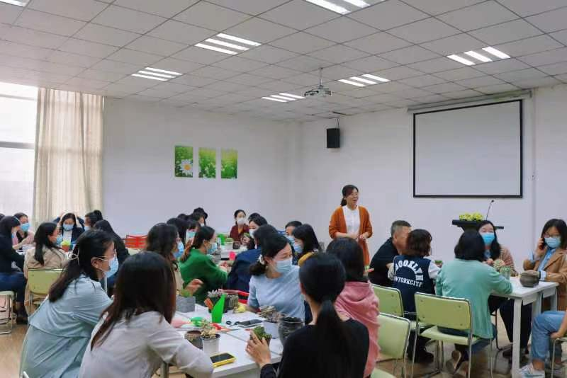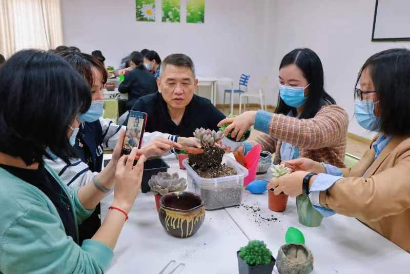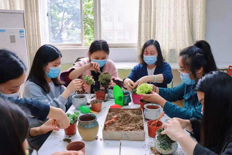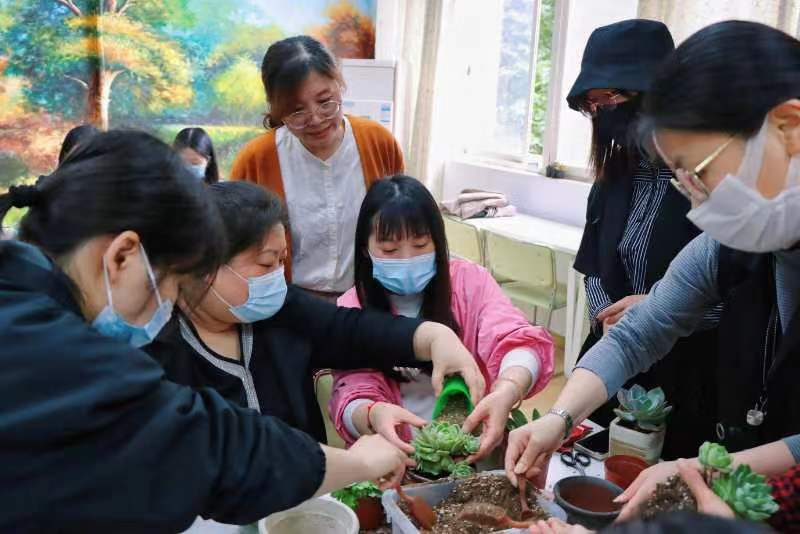 老师们听得聚精会神,手指温柔地在盆、土和绿植之间穿梭。不一会,一盆盆充满生机的多肉盆栽便呈现在大家的手中。看着自己的作品,每个人脸上都露出了满意的笑容。
