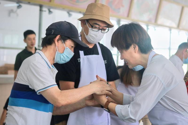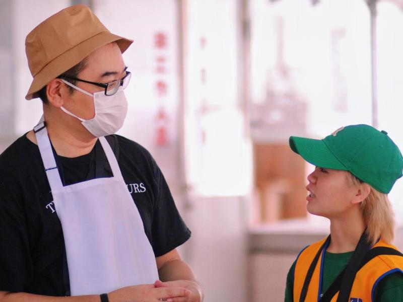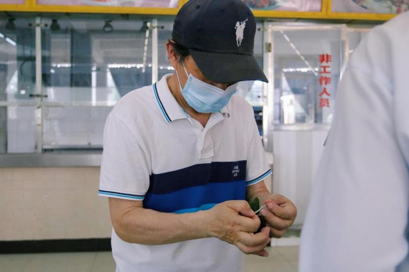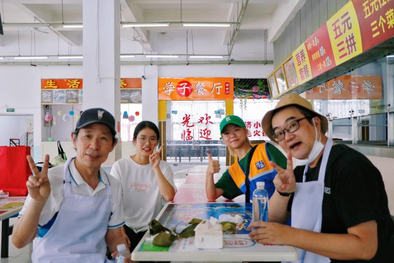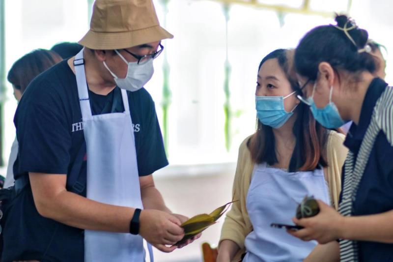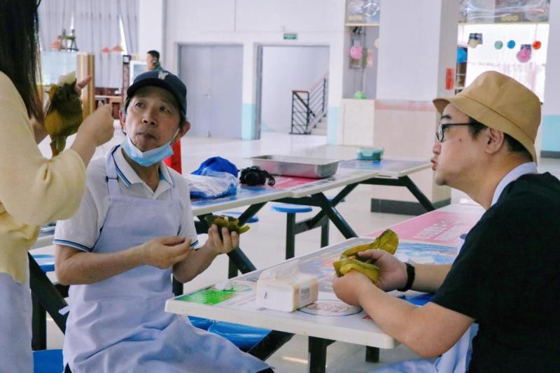 “味道不错,好吃!”体验包粽子过后,两位体验官坐下来品尝食堂精心准备好的粽子。他们解开缠绳,剥开粽叶,将露出的粽子一角送入口中,细细品尝。谢林余在一旁耐心讲述粽子的种类和吃法,并与两位体验官交谈甚欢。“我觉得包粽子有点难,我包得不好看,但是我喜欢吃粽子,特别是猪肉粽。”永利智夫说。