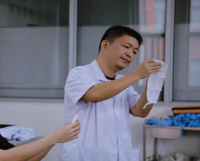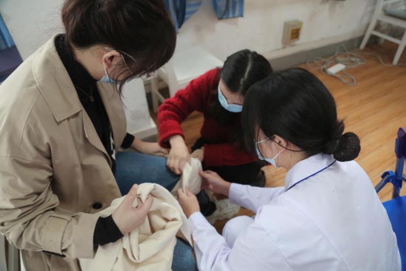 医学部护理系副主任吴际作止血包扎培训。吴际详细讲解止血包扎的直接压迫止血、加压止血、止血带止血3种方法,并依次进行手指、前臂、手肘、头和腘窝等部位的绷带或三角巾包扎演示。吴际提示,急救时要先止血再包扎,根据不同的出血情况进行基本包扎。