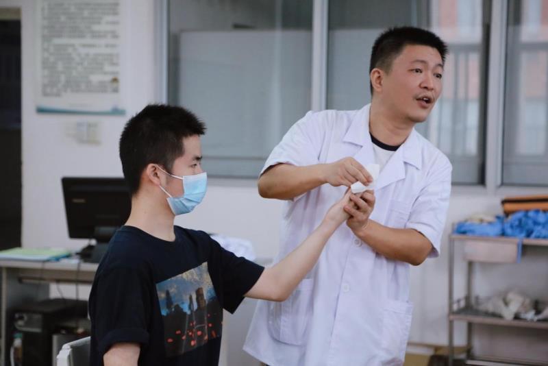演示完毕,教职工踊跃提问,积极动手实践,有包扎培训经验的学生志愿者也耐心解答教师们的各类提问,在掌握包扎要领的情况下完成各部位出血后的止血包扎。