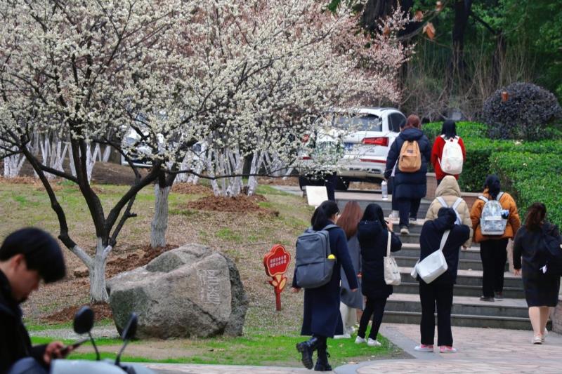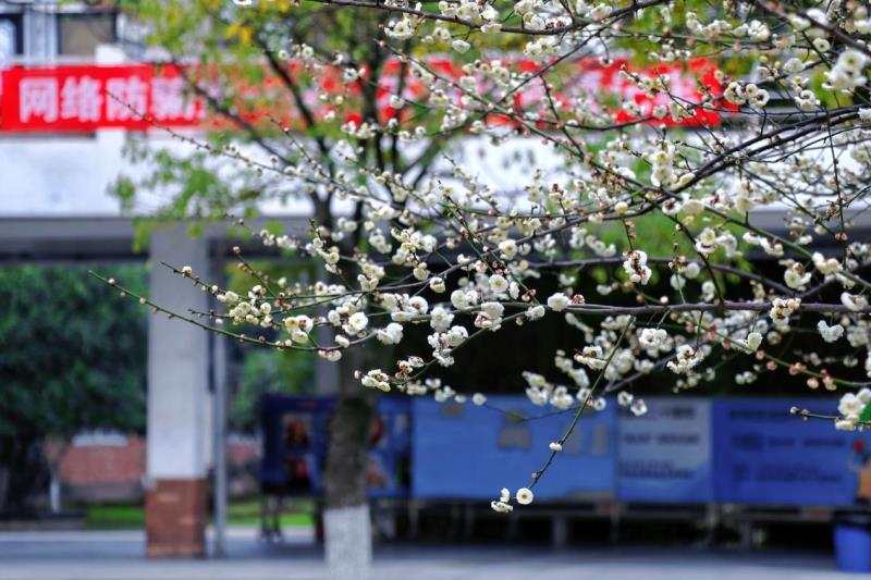 教学楼前,梅花灿若云霞,成片绽放。白色、淡粉色挂满枝头,一阵微风拂过,花瓣随风洒落,在地上堆叠。远远望去,好似下了一场雪,引得不少学生驻足拍照。