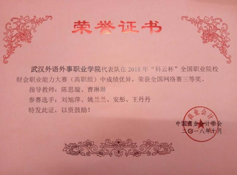 2018年10月27日,我院财经与商贸学部代表队参加了由中国商业会计学会主办、厦门科云信息科技有限公司承办的2018年“科云杯”全国职业院校财会职业能力大赛(高职组)。本次比赛有全国31个省市的300多所院校,超5万名学生参与。经过全国网络赛六个小时的激烈比拼,陈思璇、曹琳琳老师所带领的飓风小队(姚兰兰、安彤、刘旭萍、王丹丹)获得全国网络赛三等奖的好成绩。