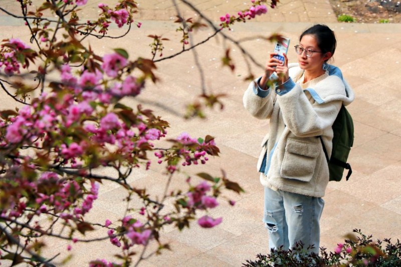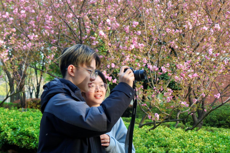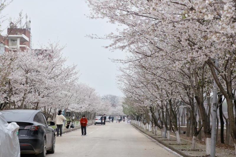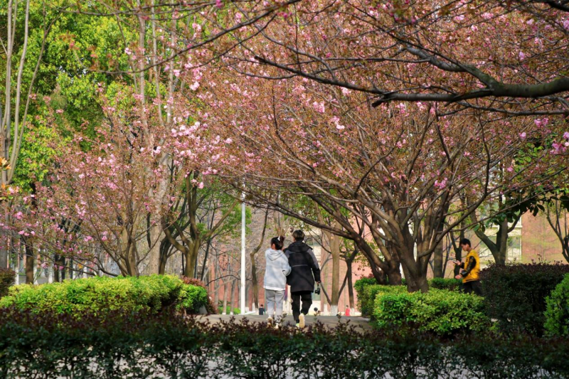 学院南区教学楼后方的樱花路,两侧近百株樱花一字排开,在暖阳里争相怒放,如云似霞,满树灿烂。师生以及附近的居民纷纷前来欣赏美景,拍照留念,感受春天的气息。
