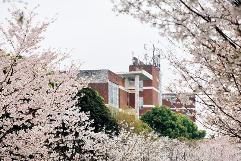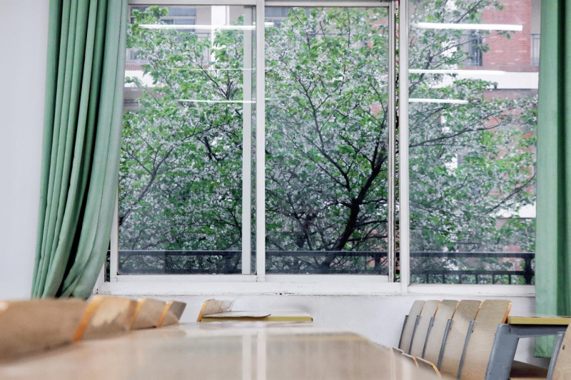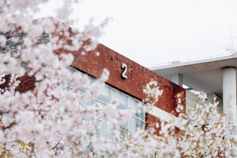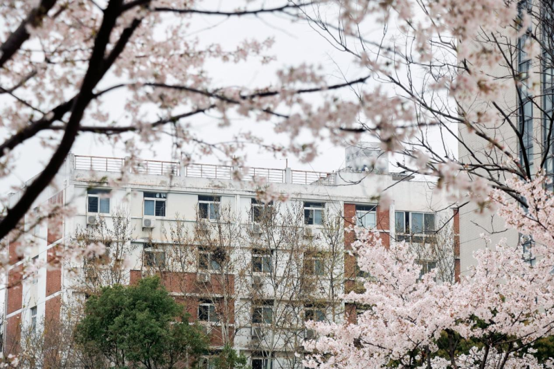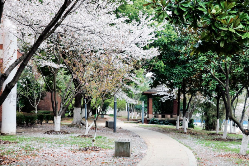 在南四和南五教学楼间,白色的樱花也争奇斗艳,教室被樱花簇拥着,与学生隔窗相望。窗内书声琅琅,窗外樱花盛放。阵阵微风拂过,瞬间飘起樱花雨,白色的花瓣洋洋洒洒,飘落满地,似霜若雪,引得人们一阵阵惊呼。