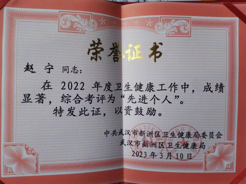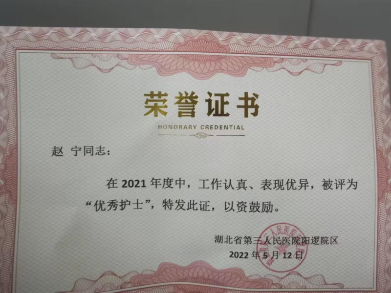 从业以来,赵宁以一丝不苟的工作态度、头角峥嵘的工作成绩荣获2021年度“优秀护士”、2022年度“先进个人”等奖项,并于2022年6月在华中科技大学同济医学院附属医院协和医院重症医学科护理专业学习3个月,获得结业证书。