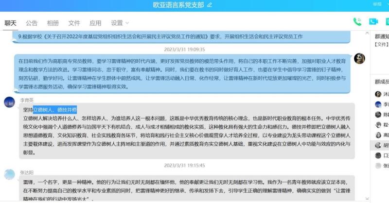 在党务公开环节,吴佳妮向全体党员通报了学部2023年度民主生活会征求意见情况及召开情况。随后,带领全体党员开展集中学习,依次学习了《习近平总书记出席中共中央党校建校90周年庆祝大会暨2023年春季学期开学典礼并发表重要讲话》《习近平对深入开展学雷锋活动作出重要指示强调:深刻把握雷锋精神的时代内涵,让雷锋精神在新时代绽放更加璀璨的光芒》《中国共产党纪律处分条例》(摘录)》等文件和重要讲话,并和大家一起重点学习了《关于深化纠治“四风”工作的实施意见》和学院文件《开展违规吃喝问题专项整治的实施方案》,各位老师在线学习并深入地展开了讨论。