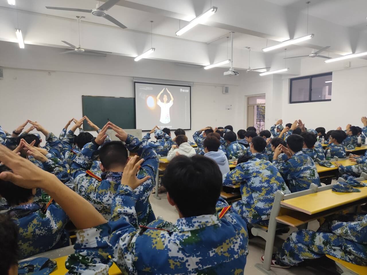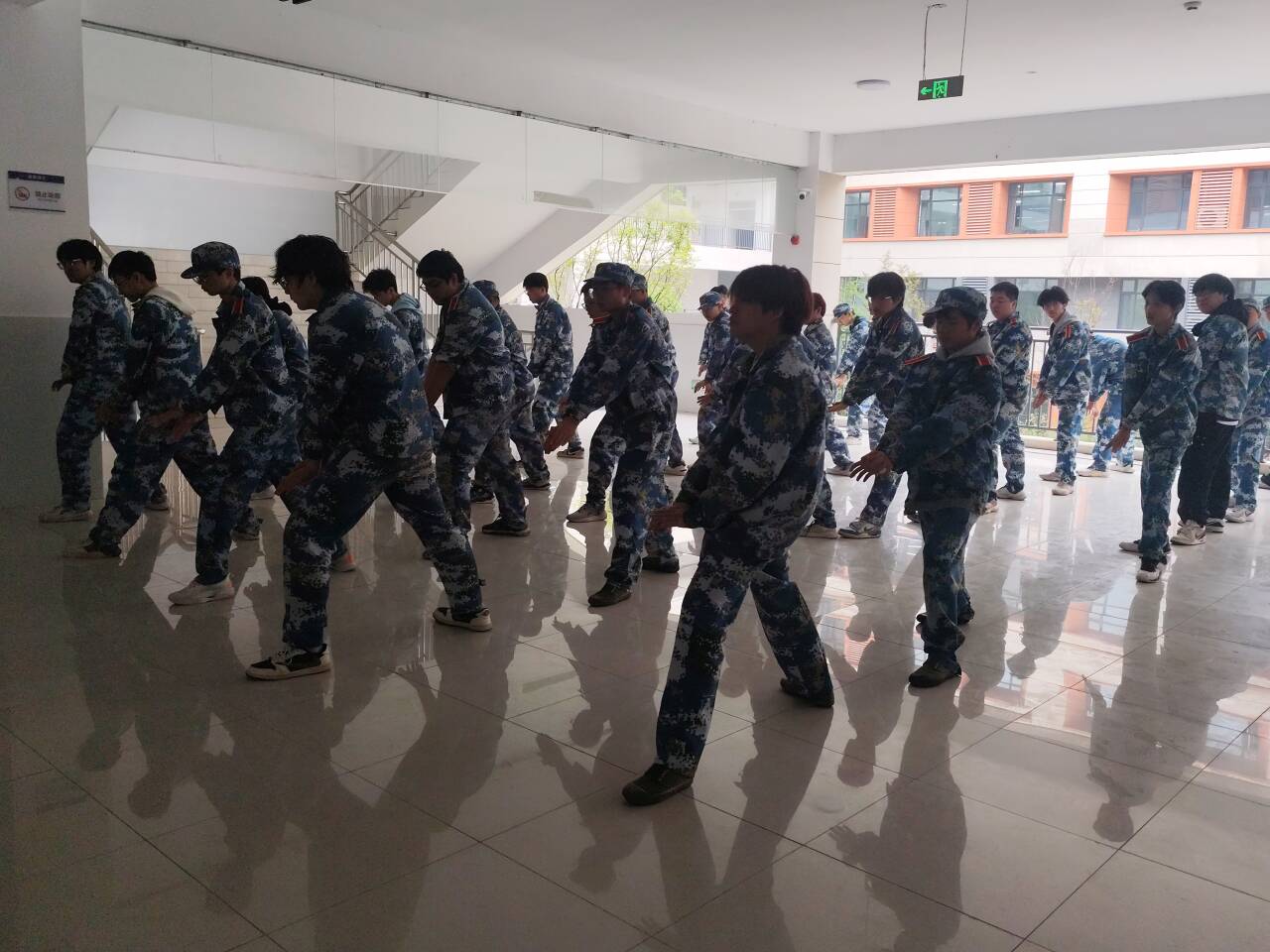 训练场地虽变,但我院学子的热情与专注丝毫未减。各连队根据安排有序行动,呈现出多线并行的丰富场景。部分连队在宽敞教室练习手语操,学子们指尖起落间,将青春朝气与家国情怀融入无声手势;另有连队集中观看军体拳教学视频,在细致观察中学习动作要领,为后续实操打下基础;也有连队组织观看红色影片,在光影故事中感悟革命先辈的奋斗精神,接受深刻的思想熏陶;还有连队利用教学楼楼道空间,开展队列、军姿等基础训练,教官们逐人纠正动作,确保训练标准不降低。