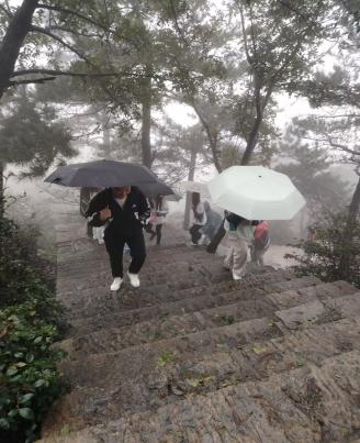 登山的路,因雨水变得格外挑战。湿滑的石阶是不小的挑战,弥漫的雾气让前路若隐若现,但老师们没有丝毫退缩。他们相互扶持,时而提醒同伴注意脚下,时而在雨中定格下欢乐的瞬间。每一步攀登,都是对“坚持不懈”的诠释;每一次驻足,都是对自然与团队力量的致敬。雨水打湿了衣裤,却浇不灭心中的热忱;雾气遮挡了视线,却挡不住向上的决心。在这段雨中征程里,老师们用行动证明:困难从来不是停滞的理由,唯有坚守,方能抵达远方。