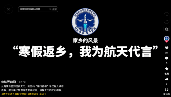 除校园宣讲外,学子们还立足家乡开展航天与低空技术科普宣传活动。通过现场讲解、短视频传播等多种形式,向社会大众普及航天知识、低空经济发展、无人机技术应用、航空安全常识等内容,讲述中国航天从追赶到并跑、领跑的奋斗历程,展现国家商业航天与低空产业蓬勃发展的时代风貌,引导更多人关注航天事业、支持科技发展,厚植青少年科技报国、空天强国的理想信念。