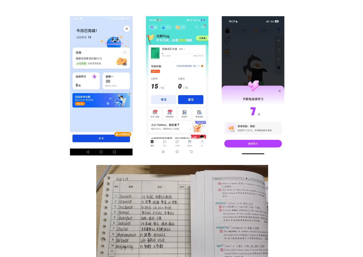 参与活动的学生纷纷表示,7天的打卡历程虽短,但收获颇丰,不仅突破了自身学习惰性,积累了更多单词,更感受到了群体学习的动力与温暖。未来将把打卡中培养的自律与坚持融入日常学习生活,主动夯实英语基础,积极参与学风建设活动,以扎实的学识、昂扬的姿态,践行航天学子的使命与担当。
