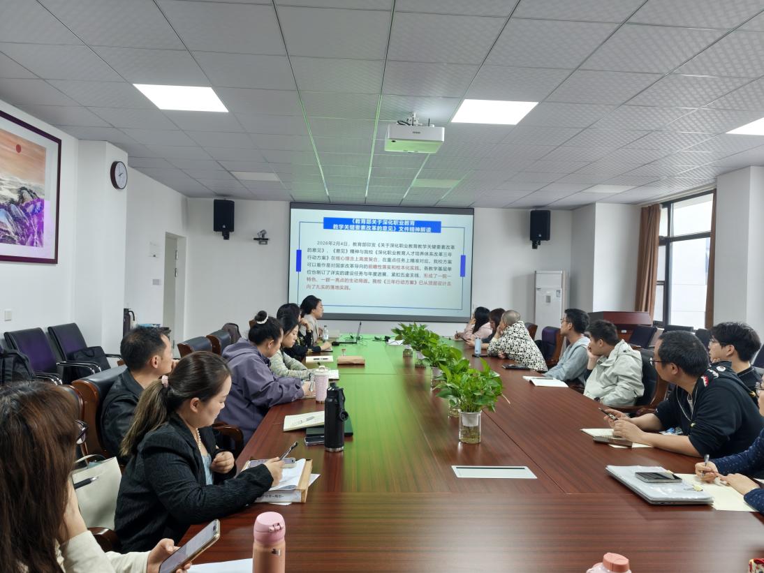 会议首先开展职业教育政策专题学习,重点解读《教育部关于深化职业教育教学关键要素改革的意见》,将文件精神与学校“三年行动方案”紧密结合,围绕“专业、课程、教材、教师、实习实训”五金建设,明确学院专业群发展、人才培养模式改革、产教融合推进方向,强化“专业技能 + 外语特长 + AI 基础”特色落地。