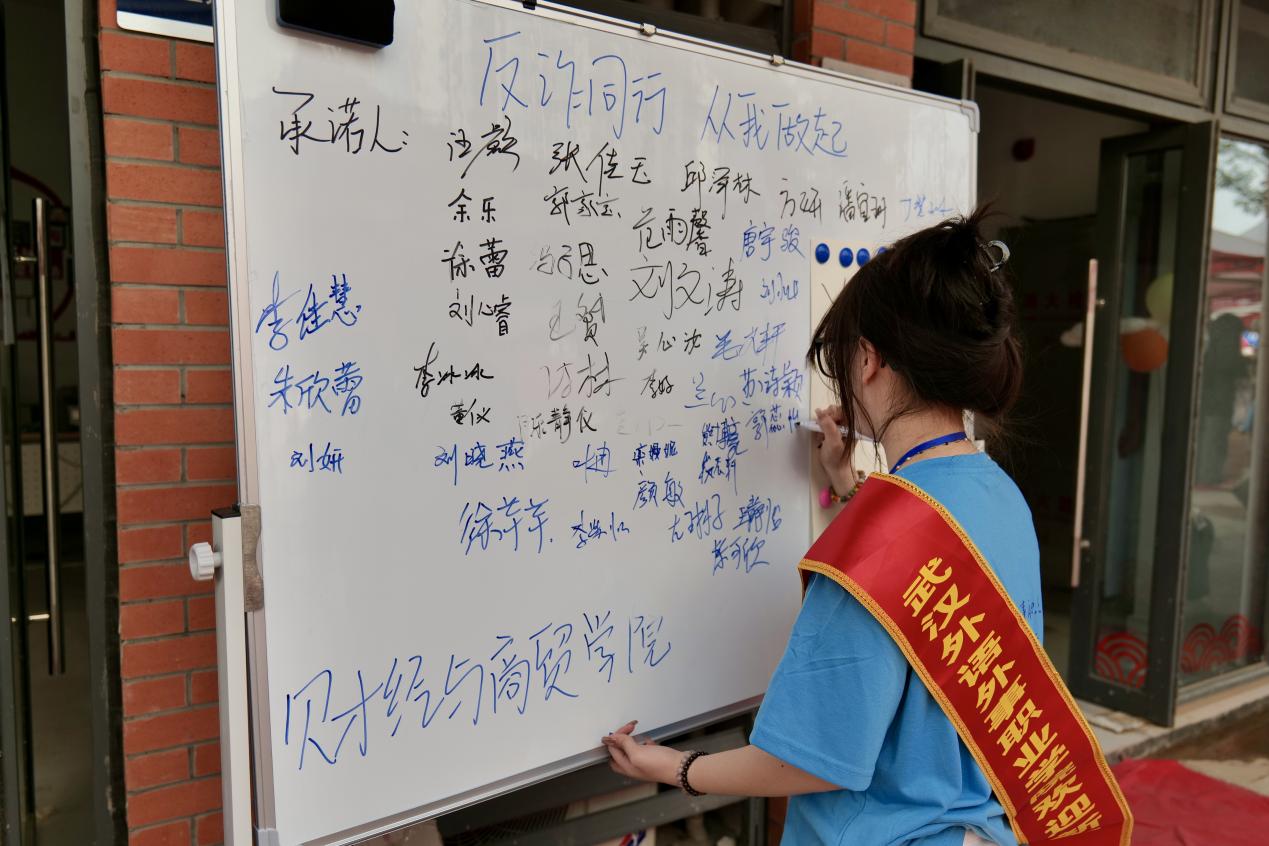除了贴心的行李搬运和路线指引,财贸学院在报到点设置的“防诈骗承诺签字墙”,也成了新生和家长必去的“安全教育打卡地”。学院负责人表示,新生刚进入校园,社会经验不足,对电信诈骗的手段了解较少,这次反诈宣传就是要提前为他们筑牢财产安全屏障。不仅要防止新生被“虚假助学金申请”“假冒网购退款”等诈骗信息欺骗而遭受损失,还要帮助他们养成“遇事多留心、凡事多确认”的安全习惯,从入学第一天就建立起防范意识。