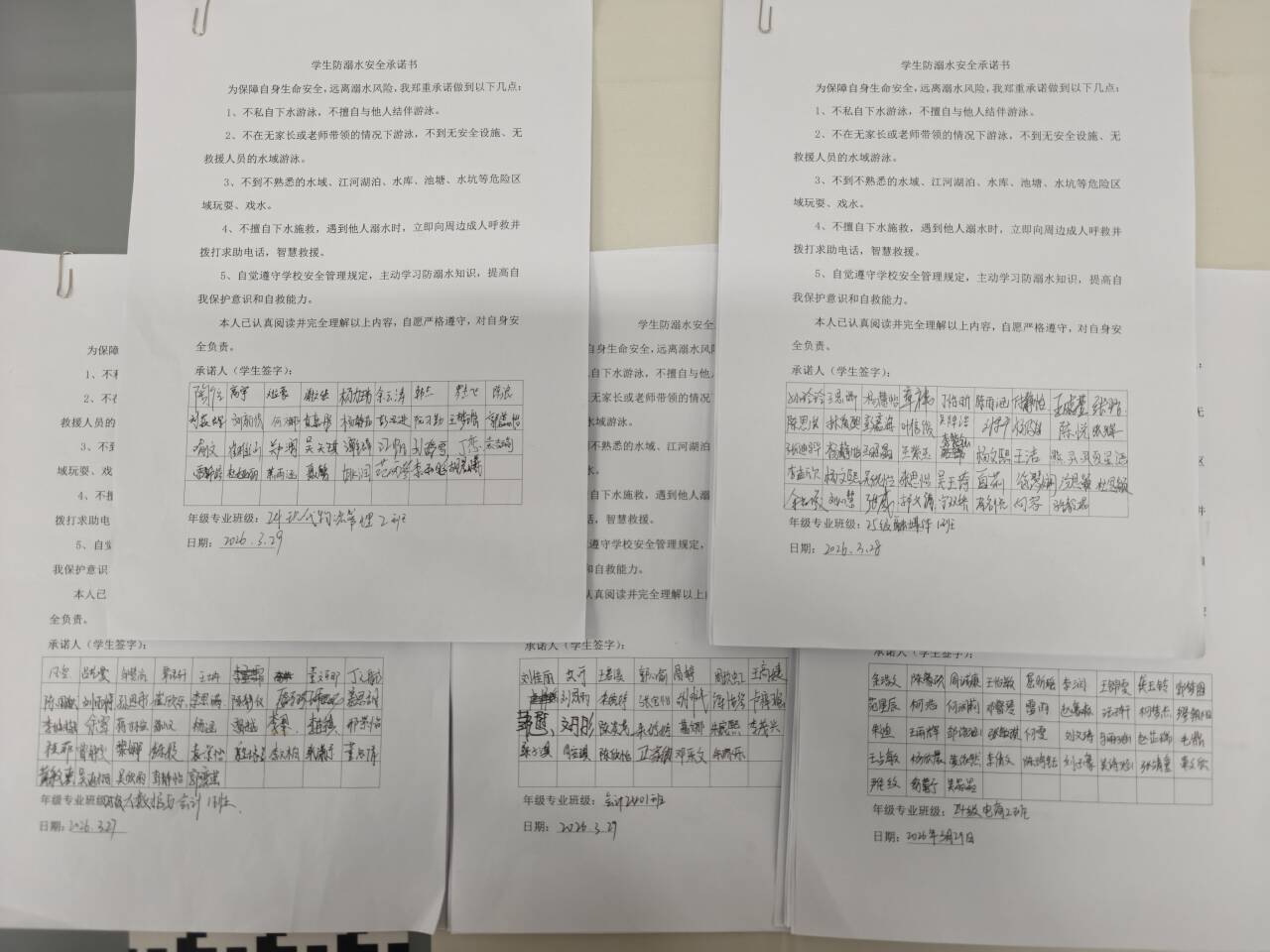 最后,学院组织全体学生逐一签订《防溺水安全承诺书》。同学们认真阅读承诺条款,郑重签字践行承诺,自觉将防溺水安全要求内化于心、外化于行,主动远离野外危险水域,时刻绷紧安全之弦。