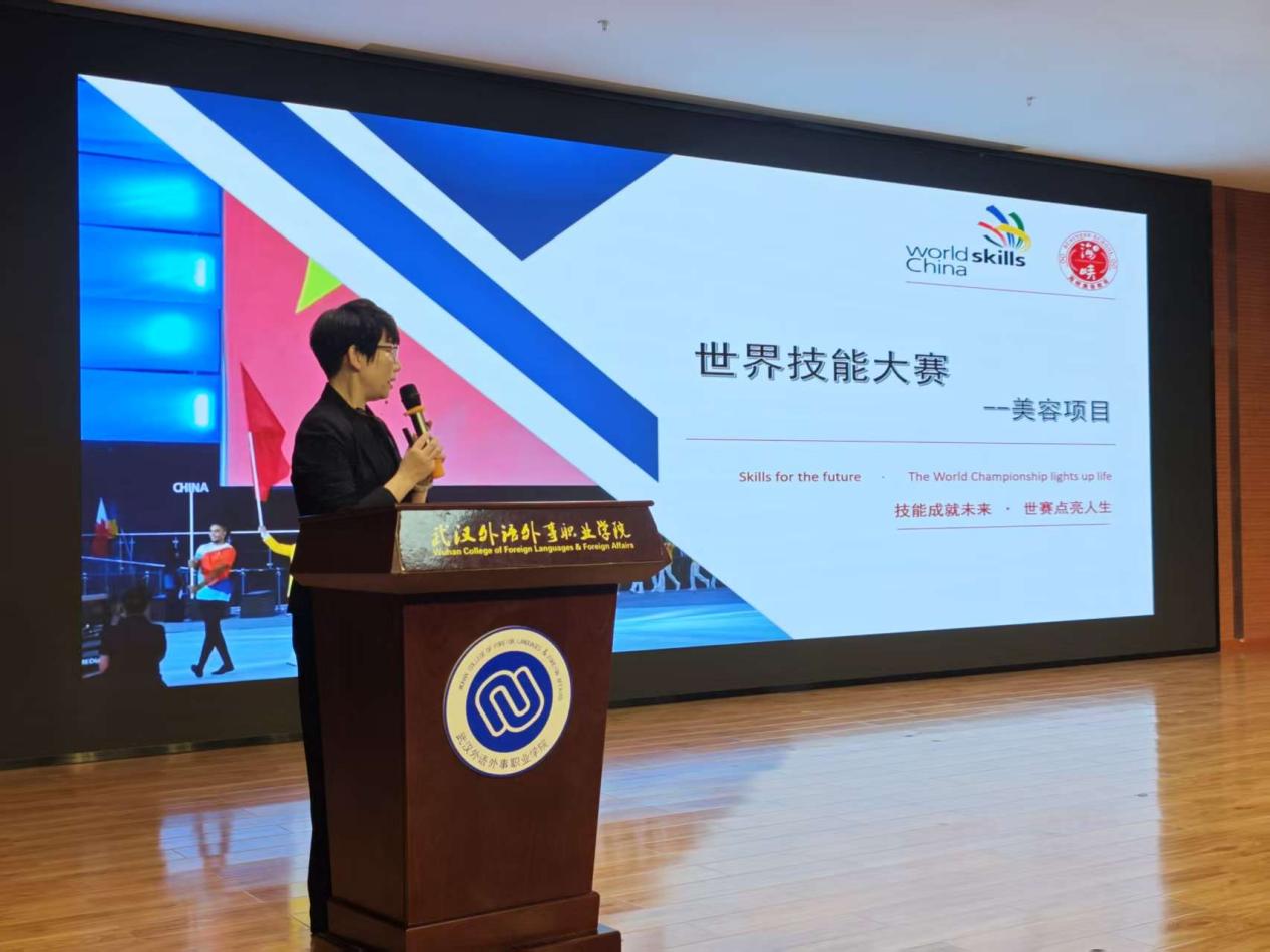 接着,武汉海峡萧氏美容团队的老师们围绕世界技能大赛展开了详细介绍。从大赛的竞赛项目、奖励政策,到全国职业技能大赛作为世界技能大赛中国选拔赛的重要地位,再到武汉海峡形象健康管理学院作为美容项目湖北省集训基地的优势与成果,老师们通过丰富的案例和详实的数据,向同学们展示了技能大赛的广阔平台与职业发展机遇。此外,现场还介绍了世界技能大赛美容项目的选拔条件,以及往届获奖选手的杰出事迹,极大地激发了同学们对技能学习的热情与向往。