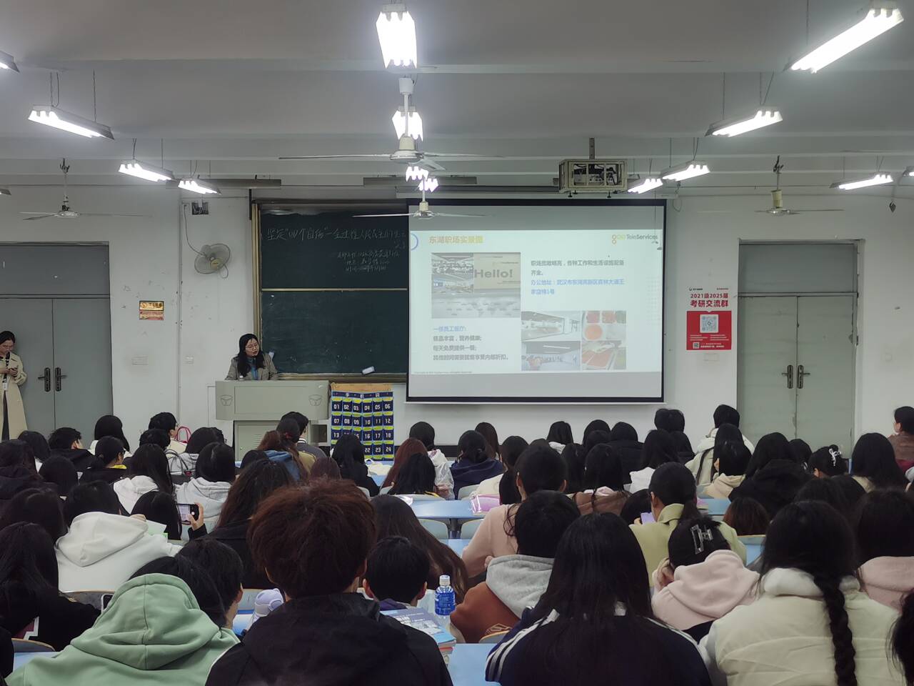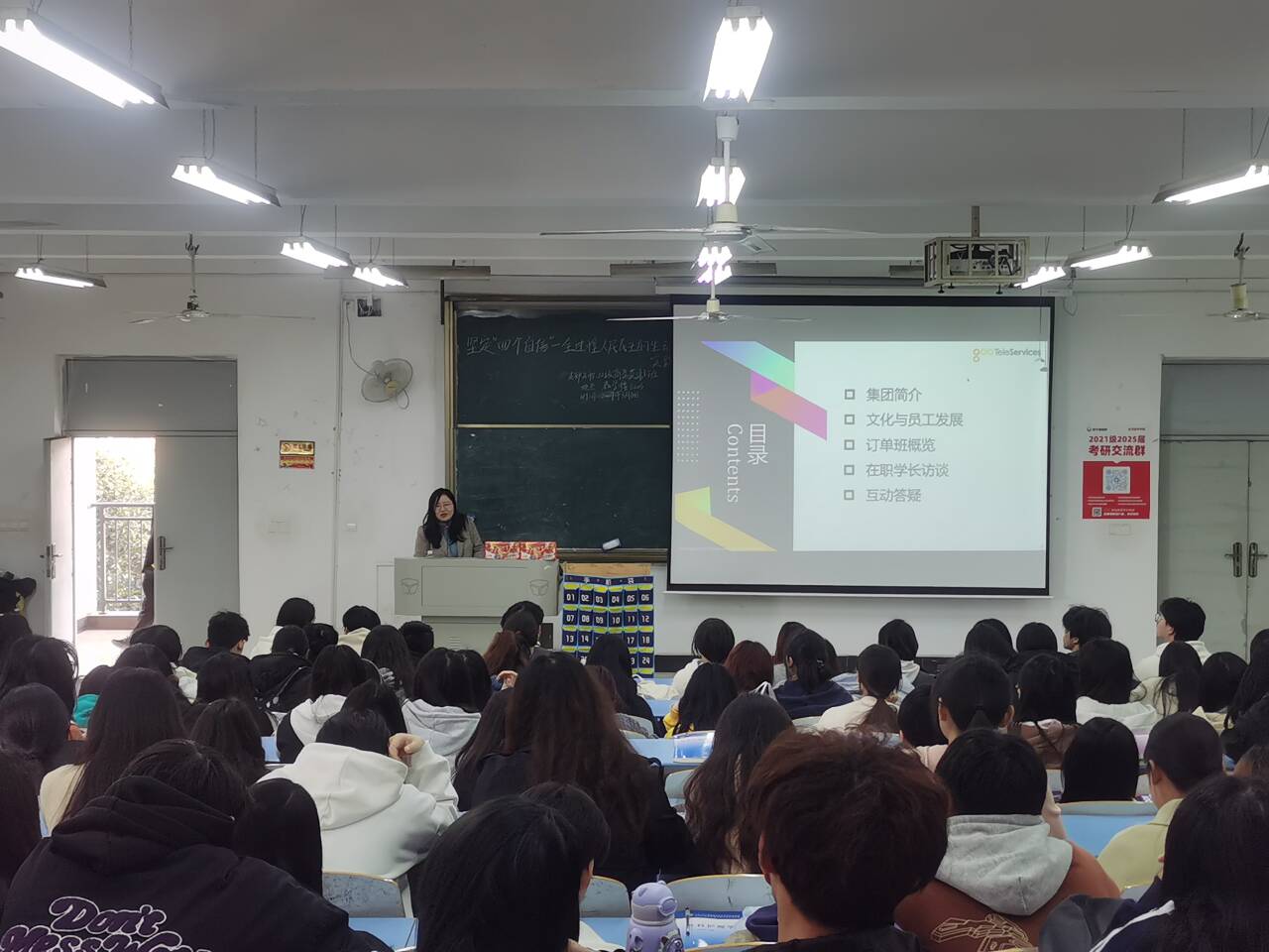 为拓宽学生实习就业渠道,切实推动学生高质量实习就业工作,武汉外语外事职业学院应用外国语学部邀请飞翱集团于3月19日在东湖校区南教学楼6203教室开展校园宣讲会,应用外国语学部22级各专业同学积极参加。