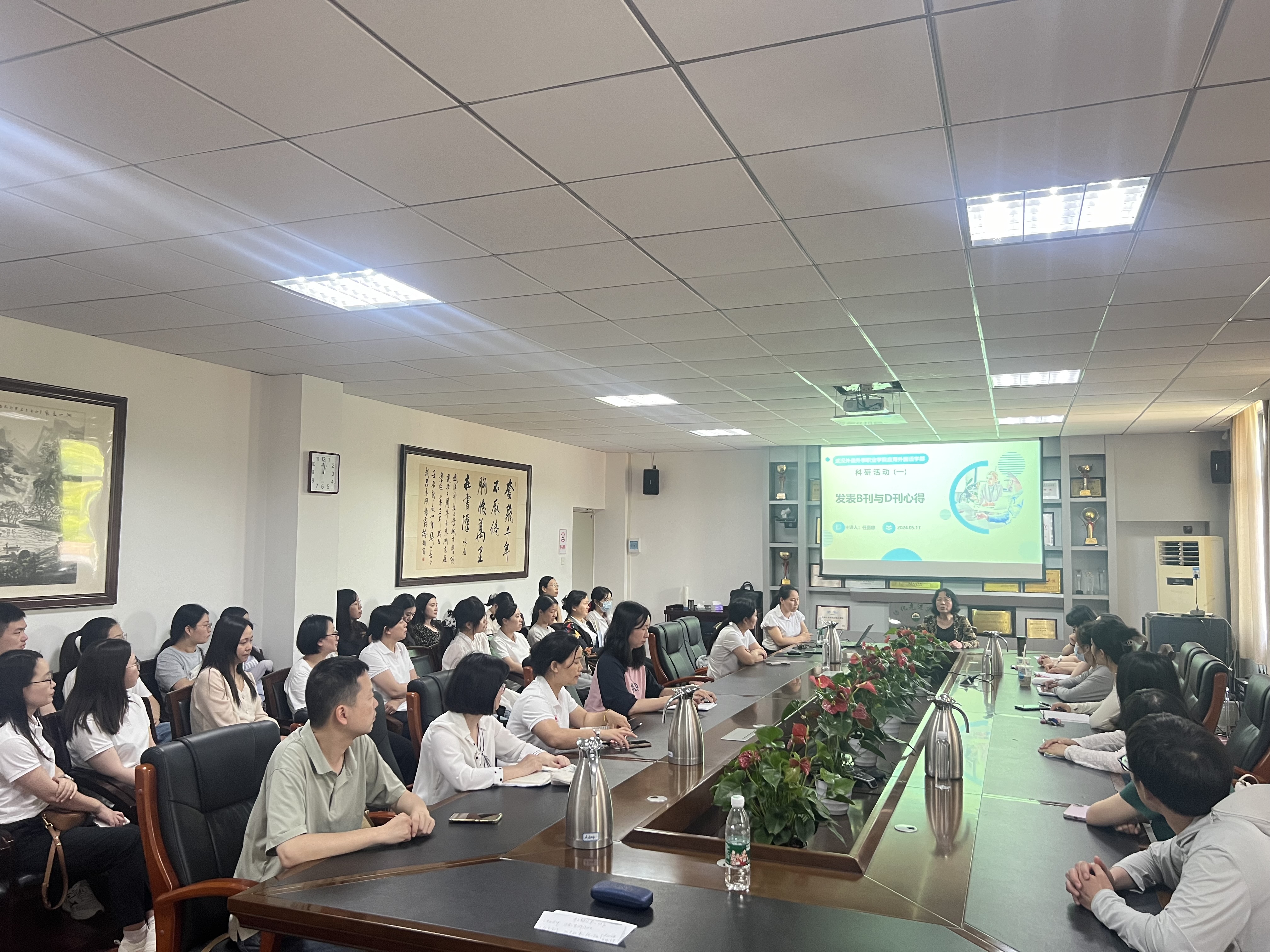 2024年5月17日中午,学部任丽娜老师利用中午时间,在行政楼A315会议室跟应用外国语学部全体教工做了一场科研讲座。