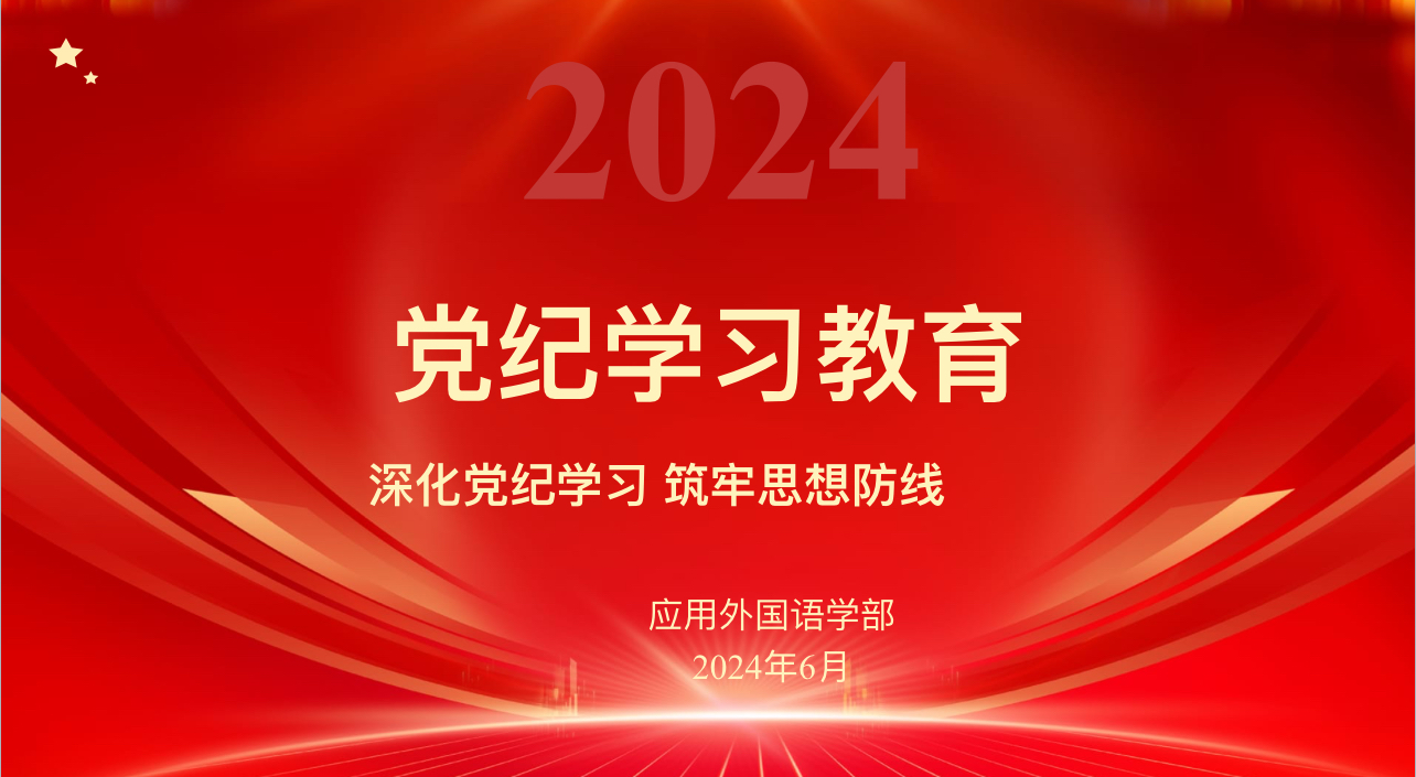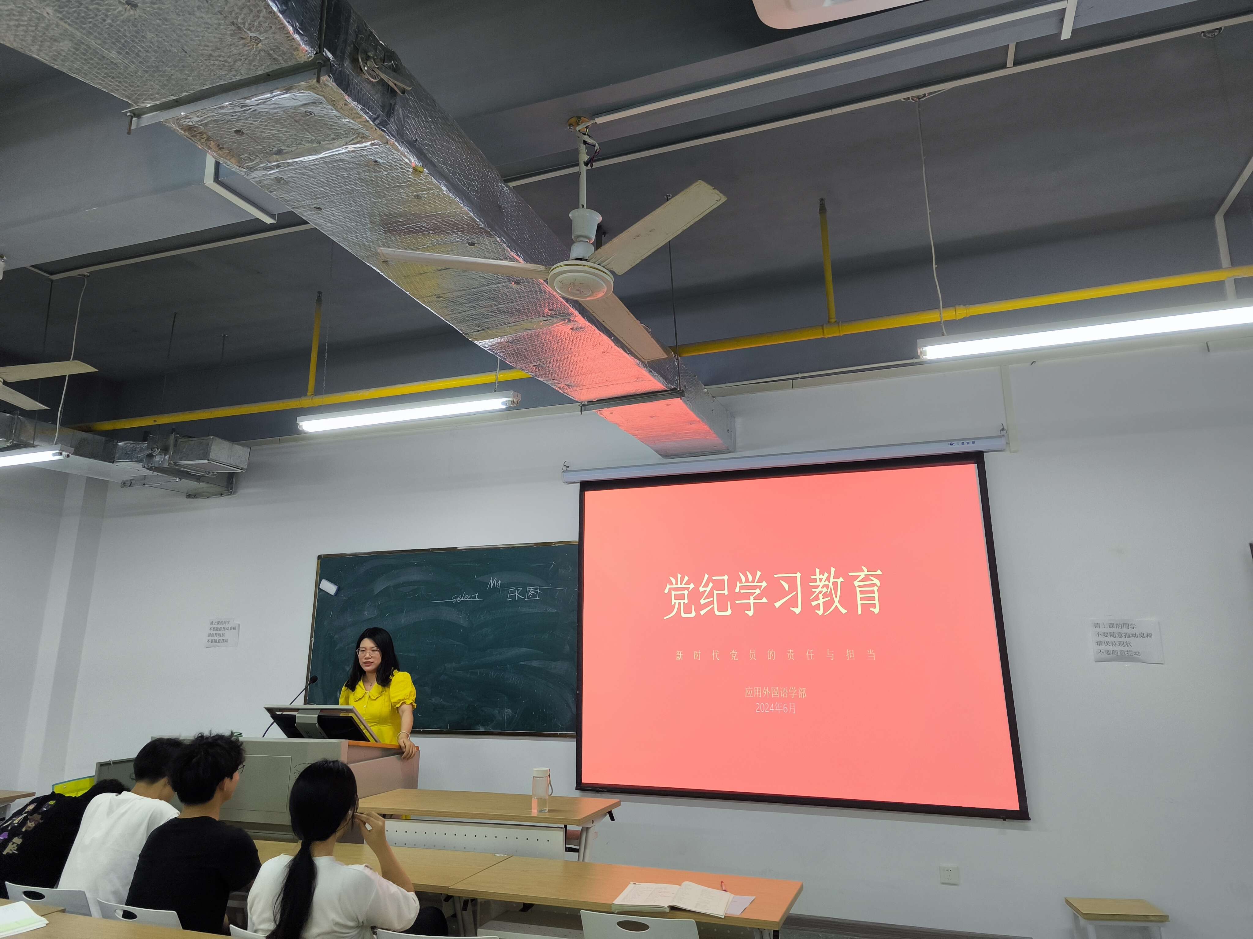 为全面贯彻落实学院党委关于开展党纪学习教育的相关要求,引导教职工党员进一步严明政治纪律和政治规矩,近期,应用外国语学部学部党总支副书记胡蓉以《深化党纪学习 筑牢思想防线》为题,为教工党员讲授了一堂理论知识扎实、实践内容丰富的专题党课。围绕新修订的《中国共产党纪律处分条例》,从“2024党纪学习教育是什么?高校教工党员怎么学?”、“加强纪律建设是无产阶级政党的本质属性”、“完成新时代党的使命任务需要加强纪律建设”、“学部加强党的纪律建设的主要着力点”等方面进行了阐述。同时学部两个教工支部和学生支部也开展了相应的党纪学习。