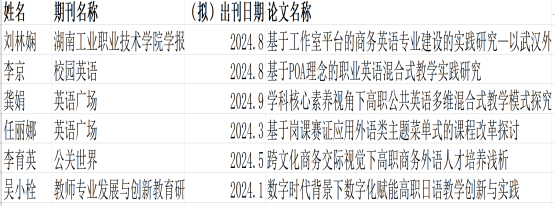 今年上半年,应外学部教科研方面有所成绩,获批院级教研项目1个,科研项目1个,湖北省职教学会项目1个,在知网收录期刊上发表论文6篇,出版教材1部。具体如下: