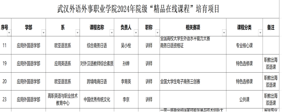 根据学院《关于开展武汉外语外事职业学院职业教育在线精品课程首批培育活动的通知》精神, 经各教学单位申报,教务处审核,学院教学指导委员会评审,学院研究决定拟对《管理会计实务》等25门精品在线课程进行正式培育,应外学部4门课程获批。