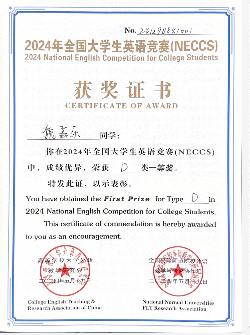 今年6月13日,2024年全国大学生英语竞赛(2024 National English Contest Students,简称NECCS)湖北赛区决赛获奖公布,我院应用外国语学部西班牙语专业魏嘉乐同学获得大赛全国决赛一等奖好成绩,另还有获二等奖2名,三等奖3名的佳绩。