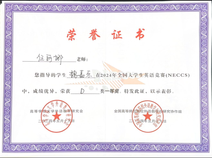 该竞赛参赛人数多、竞赛难度大,竞赛等级高。我校学生魏嘉乐自今年始就积极备赛,在4个月的备赛中,学习近8年来的初赛、决赛、总决赛历年真题,并反复研究,与指导老师多次讨论,制定备赛计划,攻克难点。该同学比赛结束后说:“我的弱点是知识拓展部分和语法改错,做完历年真题后我总结了一些规律和知识盲区点,这对我这次的比赛帮助很大。”经过了几个月的努力,魏嘉乐同学终于实现了突破,取得了好成绩。