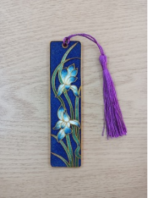 学生制作的掐丝珐琅书签,蓝色背景上绘有兰花图案,配以紫色流苏。