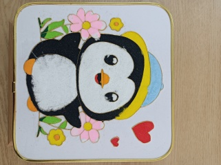 学生制作的掐丝珐琅摆件,盒面上绘有可爱的熊猫图案,周围环绕着花朵。