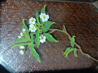 学生制作的掐丝珐琅装饰盘,盘上绘有白色花朵和绿色枝叶。