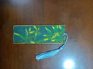 学生制作的掐丝珐琅书签,绿色背景上绘有竹叶图案,配以蓝色流苏。