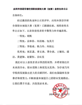 经过激烈的角逐和评委的严格评审,最终将有数名选手脱颖而出,代表学部参加学校全国职业规划大赛的决赛。我们期待他们在决赛中再创佳绩,展现我学部学子的风采。以下是本次全国职业规划大赛学部复赛的获奖名单: