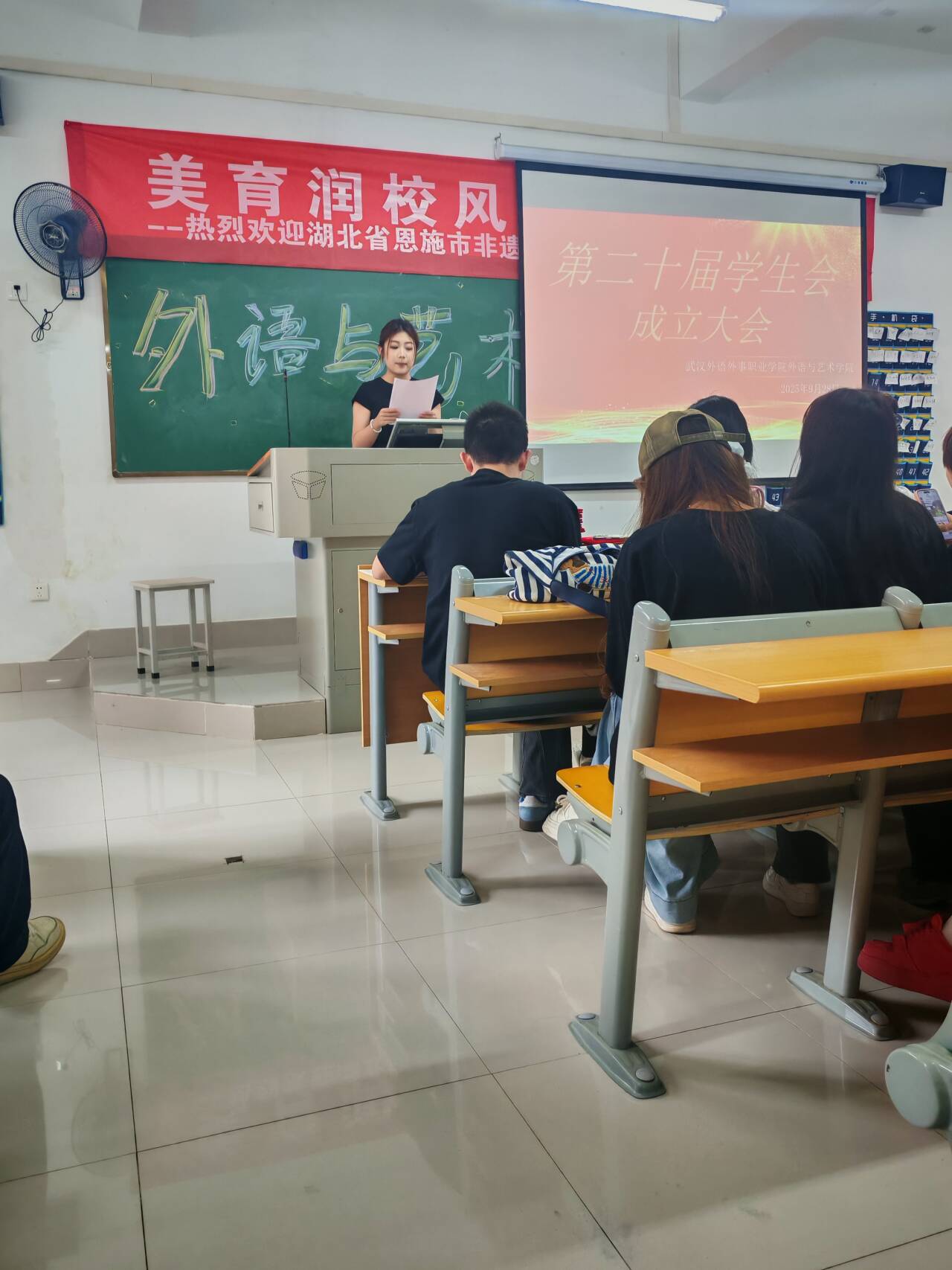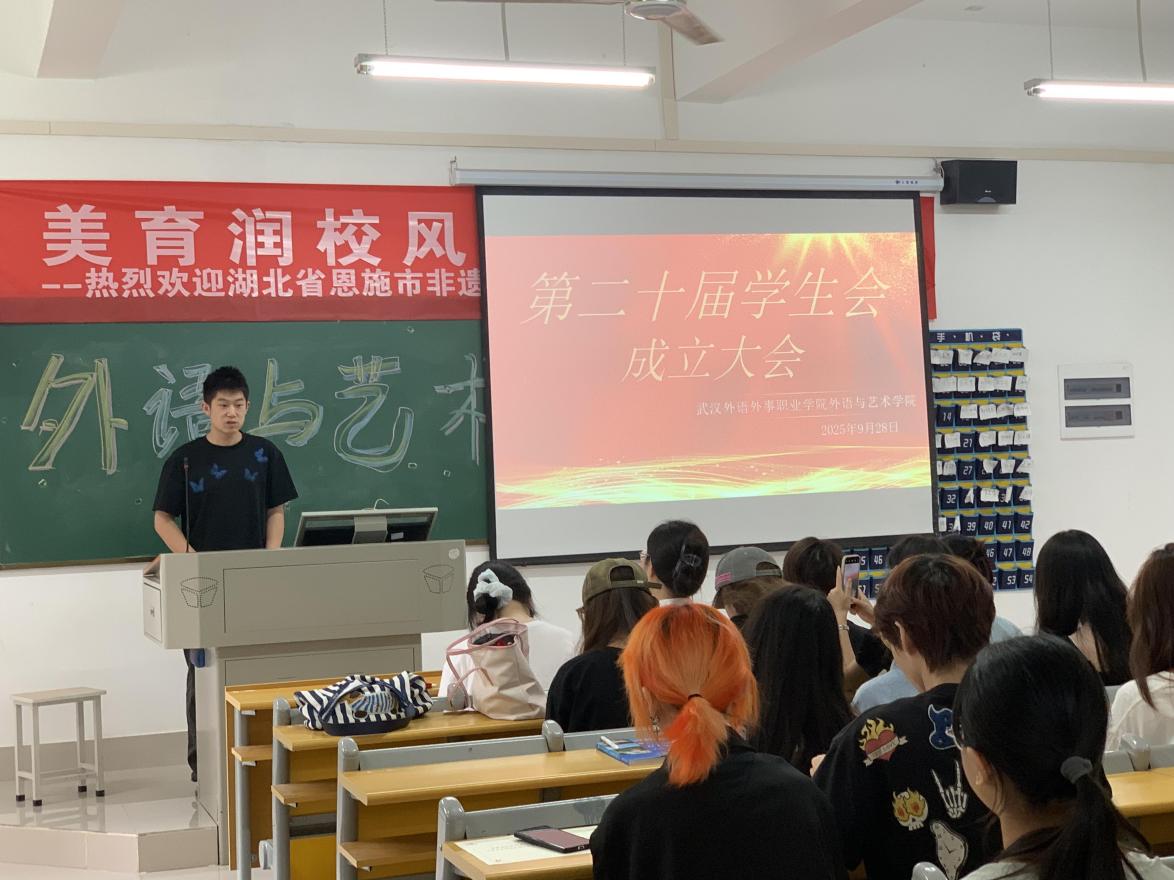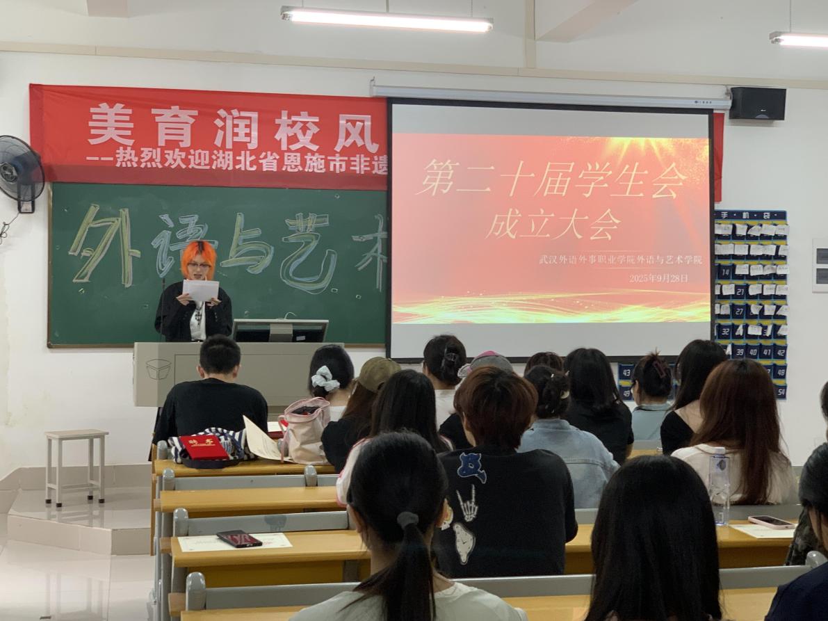 (通讯员:刘妮、赵畛含) 2025年10月9日中午,武汉外语外事职业学院外语与艺术学院第二十届学生会成立大会在学院J218教室隆重召开。学院党总支副书记胡蓉、分团委书记刘易思、25级辅导员老师祝可欣、严昕蓓,以及2024级、2025级学生组织代表共计70余人齐聚一堂,共同见证了新一届学生会的扬帆起航。