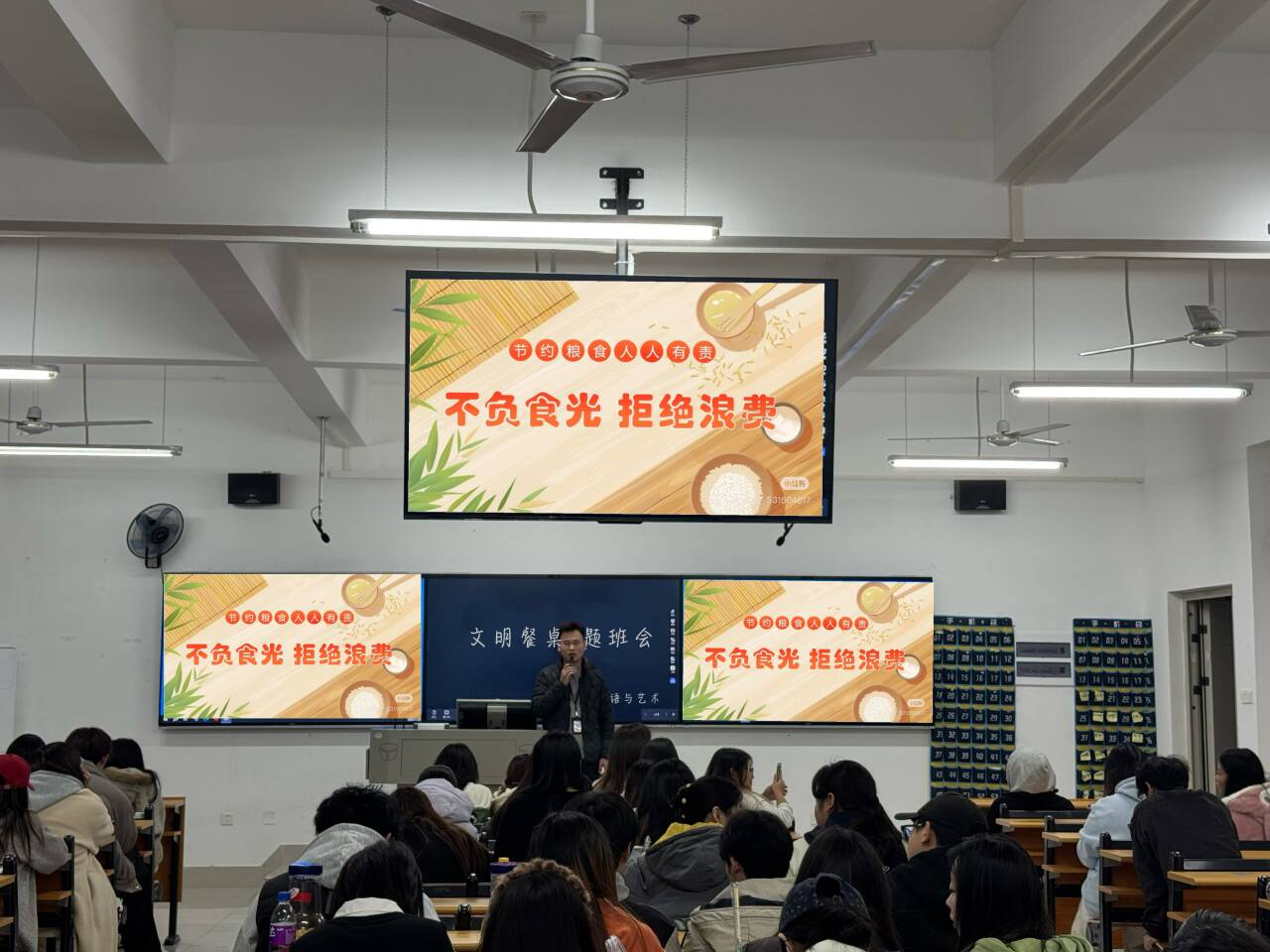 班会伊始,张憬扬老师以日常校园生活中常见的食堂、餐厅就餐场景为切入点,阐述了“文明餐桌”行动不仅关乎个人形象,更是传承中华民族勤俭节约、尊重劳动、珍惜资源传统美德的具体体现,是大学生文明素养的重要组成部分。他强调,在集体生活中,遵守就餐秩序、维护用餐环境、践行“光盘行动”、注重就餐礼仪,是每位同学应尽的责任和义务。