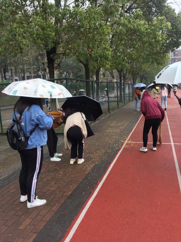 结合后勤部老师的安排,我学部负责打扫学校的大操场。各个班级按照具体的安排先去南五教学楼领取劳动工具,然后根据老师和班干部的分组开始劳动。有的小组负责捡垃圾,有的小组负责打扫落叶,还有的小组负责将垃圾运送至附近的垃圾桶。尽管当时天空飘着细雨,也有南方特有的春风吹着,但大家很积极乐观,充分享受着这份团结、协作、默契带来的劳动喜悦感。